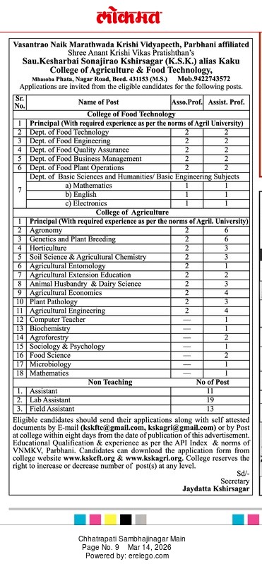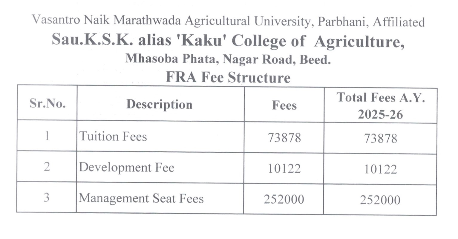 Welcome to Sau. K.S.K. (Kaku) College of Agriculture . The college is affiliated to Vasantrao Naik Marathwada Krishi Vidyapeeth, Parbhani, in the state of Maharashtra. The college began with its pursuit of enhancing rural development through affordable, accessible and adaptable education in agriculture with emphasis on research and innovation. Read More